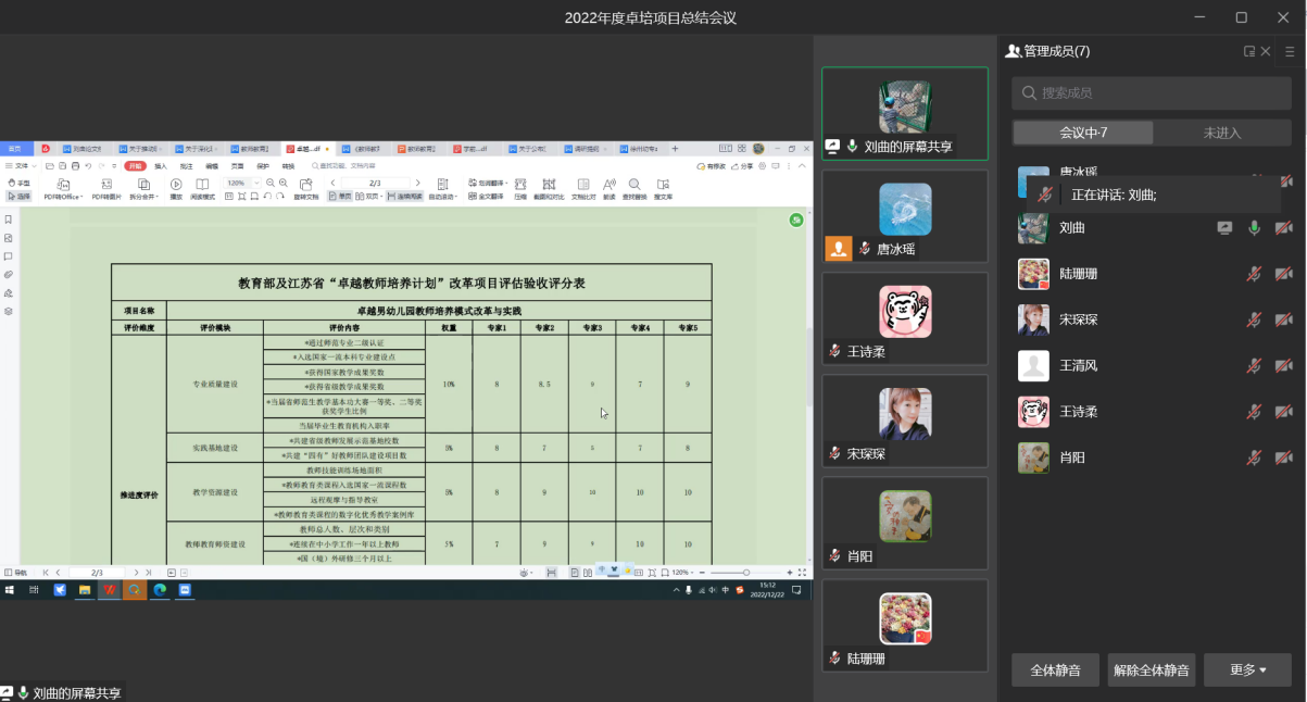 刘曲副经理首先对教育部及江苏省“卓越教师培养计划”改革项目评估验收评分表进行分析,指出项目建设的优势与不足,强调下一阶段应加强师范生培养质量评价机制建设,凸显男幼师生培养特色。随后,唐冰瑶老师布置了本年度的卓培总结和2023年度计划的撰写工作。卓培成员各自发表了自己的建议。