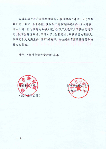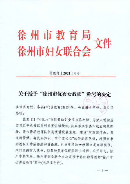 近日,徐州市教育局、徐州市妇女联合会下文《关于授予“徐州市优秀女教师”称号的决定》(徐教师【2021】4号),谈球吧辅导员李媛荣获“徐州市优秀女教师”称号。