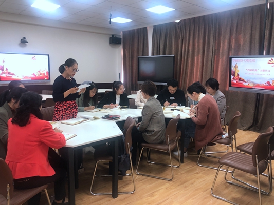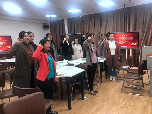 活动在国际歌声中开始。党员教师杨春慧、李慧分别作为新、老党员代表宣读当年入党志愿书,他们深情的语言,把与会党员同志思绪带回到最初那个激动人心的场景,大家回忆交流了当年的入党动机、入党后的工作和学习。全体党员在栾文娣书记的带领下,重温了入党誓词。