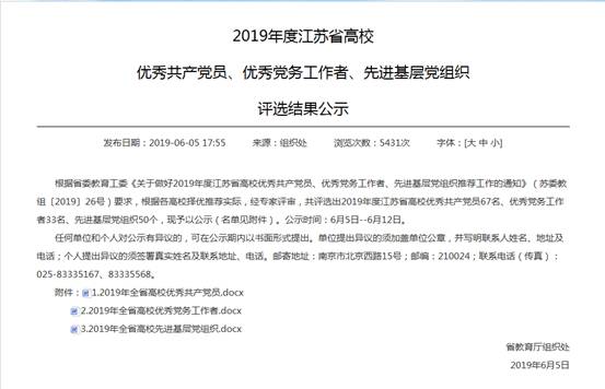 近日,江苏省教育厅组织处发布2019年度江苏省高校优秀共产党员、优秀党务工作者、先进基层党组织评选结果,公司党总支荣获江苏省高校先进基层党组织称号。