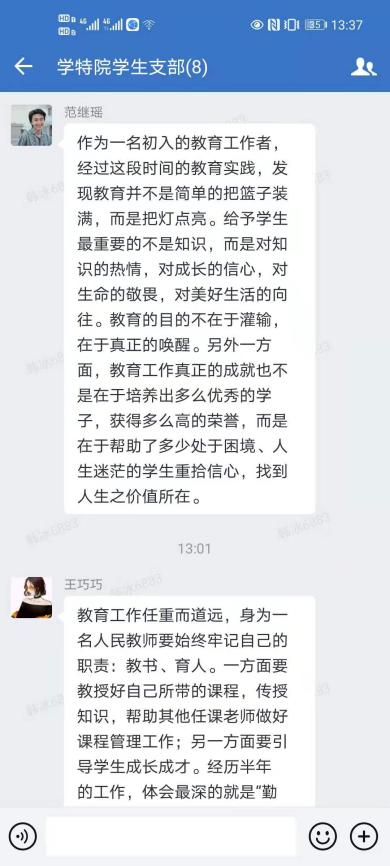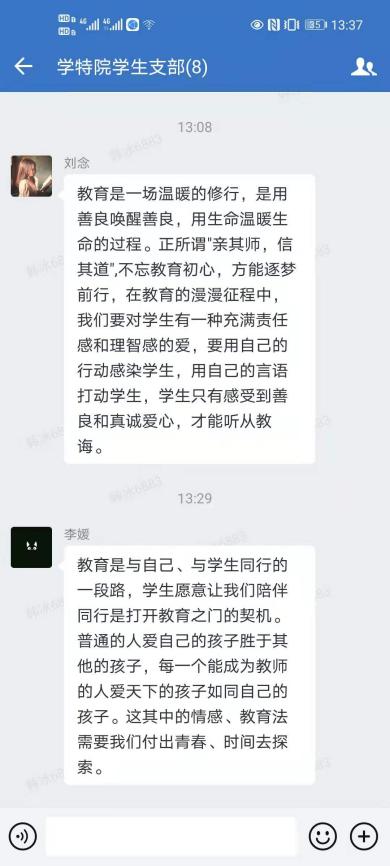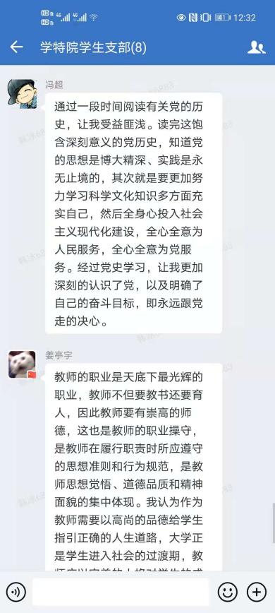 会后,各位党员老师在学特院员工党支部群里表达了自己的感想,表示要向各位教育前辈学习,立足岗位,积极发挥党员模范带头作用。