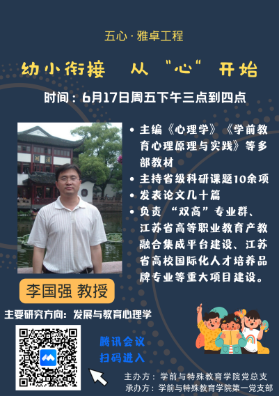 为贯彻落实教育部《关于开展2022年全国学前教育宣传月活动的通知》等文件精神,6月17日下午,公司党总支举办“五心•雅卓”工程“幼小衔接,从‘心’开始”的线上讲座活动。活动由公司党总支主办,第一党支部承办,第一党支部书记李国强教授主讲,公司附属幼儿园教师参加活动。
