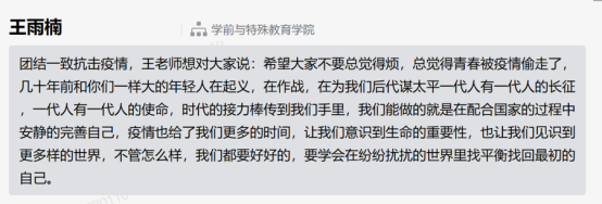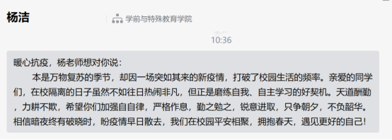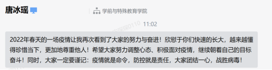 句句暖心话体现了党员老师对员工的情感支持,用关心、爱心、真心陪伴员工抗疫,成为员工成长路上的“心灵导师”。