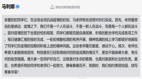越是关键时刻,越要彰显党员本色,虽然不能像白衣天使和仁者医生那样战斗在一线,但党员教师用鼓励的话语,凝聚共克时艰的精神力量。在罗教授“不经暴风骤雨,哪知彩虹绚丽”的话语中体悟人生需经历困难与挑战;在李秀敏副经理“与其哀叹,不如珍惜,拥抱每一个春暖花开;心定而安,安则不乱,脚踏实地奔星辰大海”;盖爽老师“困难终将过去,胜利一定属于我们”;宋琛琛老师“隔离病毒,但不隔离爱,因为爱是桥梁;科学防控,携手共进,因为信心是抗击疫情最好的疫苗”等话语的鼓励下,充满着抗疫的信心。
