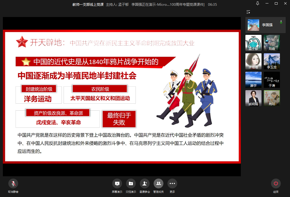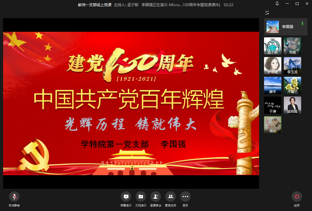 为庆祝中国共产党成立100周年,发扬和传承党的光荣传统和优良作风,进一步推动党史学习教育走向深入,6月30日晚,学特院第一党支部书记李国强以“光辉历程,铸就伟大”为主题,为支部全体党员教师讲专题云端党课。