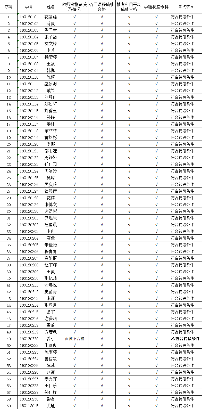 依据《南京晓庄公司高职与本科“3+2”分段培养项目转段升学考核工作办法(试行)》(南晓院【2019】20号)文件有关规定和考核结果,经员工本人申请,谈球吧资格审查,教务处复查等程序,拟同意公司2019级学前教育专业“3+2”合作培养员工花紫藤等59位同学转段申请,姜昕同学因面试成绩不合格不符合转段要求。