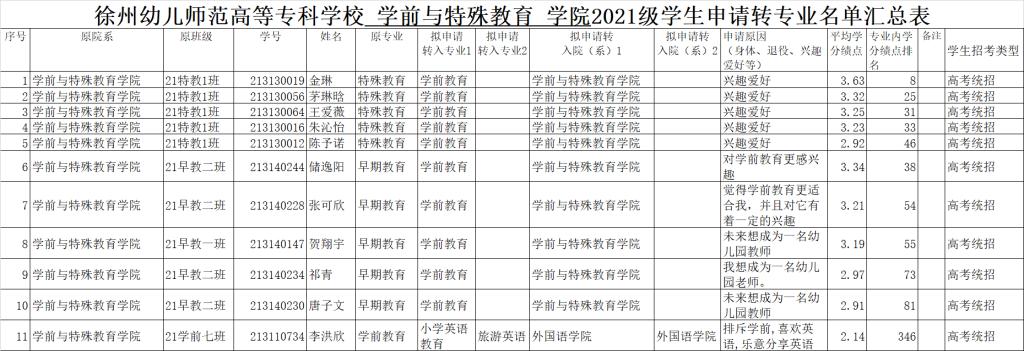 公司根据《普通高等公司员工管理规定》(教育部令第41号)、《教育部关于做好2014年普通高校招生工作的通知》(教学〔2014〕1号)、《省教育厅关于进一步加强和规范普通高等公司员工转专业工作管理的通知》(苏教学〔2014〕8号)、《省教育厅关于加强普通高等公司员工转专业工作管理的指导意见》苏教学〔2010〕20号等文件的精神,按照《谈球吧员工转专业管理办法》(徐幼专教〔2022〕1号)有关规定,经员工本人申请、转专业工作领导小组审核,同意以下11位员工转出申请,现予以公示。