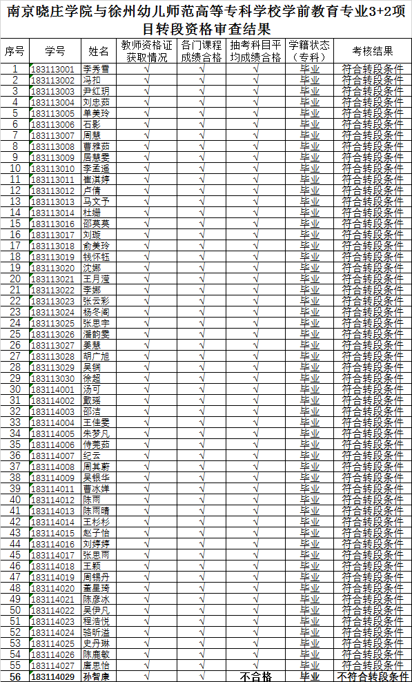 依据《南京晓庄公司高职与本科“3+2”分段培养项目转段升学考核工作办法(试行)》(南晓院【2019】20号)文件有关规定,经员工本人申请,谈球吧资格审查,教务处复查等程序,拟同意公司2018级学前教育专业“3+2”合作培养员工李秀雪等55位同学转段申请,现将名单予以公示,公示时间为2021年6月15日至2021年6月19日。